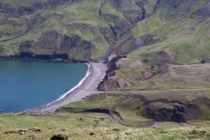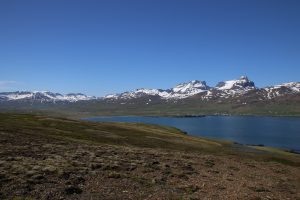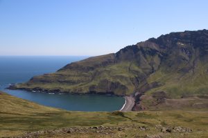 Irgendwann konnte ich mich dann schweren Herzens losreißen und mich zum Startpunkt meiner Wanderung begeben. Es war nur eine kleine Tour geplant: Ziel war die Brunavik Bucht: Einmal über einen Pass in die nächste Bucht und dann entweder auf gleichem Weg zurück oder mit einem kleinen Umweg über den Nachbarpass. Allerdings war ich anscheinend noch so in die Papageientaucher verliebt, dass der Verstand bei der Vorbereitung irgendwie aussetze. Ich bin erst kurz vor Mittag losgekommen, aber vorher nochmal etwas zu essen oder etwas mitzunehmen, kam mir nicht in den Sinn. Wasser kalkulierte ich normal bis knapp: 1 Liter für eine kurze Tour reicht normalerweise dicke. Landschaftlich war es richtig schön, allerdings auch fast schon schwül-tropisch warm. Die Luft stand, die Sonne knallte und ich lief über feuchte Wiesen. Konsequenz: mir war viel zu warm und ich habe wie verrückt getrunken. Zusätzlich bekam ich auch langsam (wie sollte es auch anders sein) Hunger. Am Pass überlegte ich dann: Weitergehen? Ich bin dann noch ein Stück weiter, so dass ich wenigstens von oben in die wunderschöne Bucht reinschauen konnte, habe mir aber den Abstieg (und den damit verbundenen Aufstieg zurück) gestrichen. Zurück ging es dann den gleichen Weg und der Abbruch war doch sinnvoll. Gegen Ende merkte ich, dass der Kreislauf vor Hunger und Durst nicht mehr ganz da ist und ich wurde extrem hektisch. Zurück am Bus gab es dann erstmal Essen und Trinken, wobei ich damit noch nicht wieder zu 100% wiederhergestellt war.
